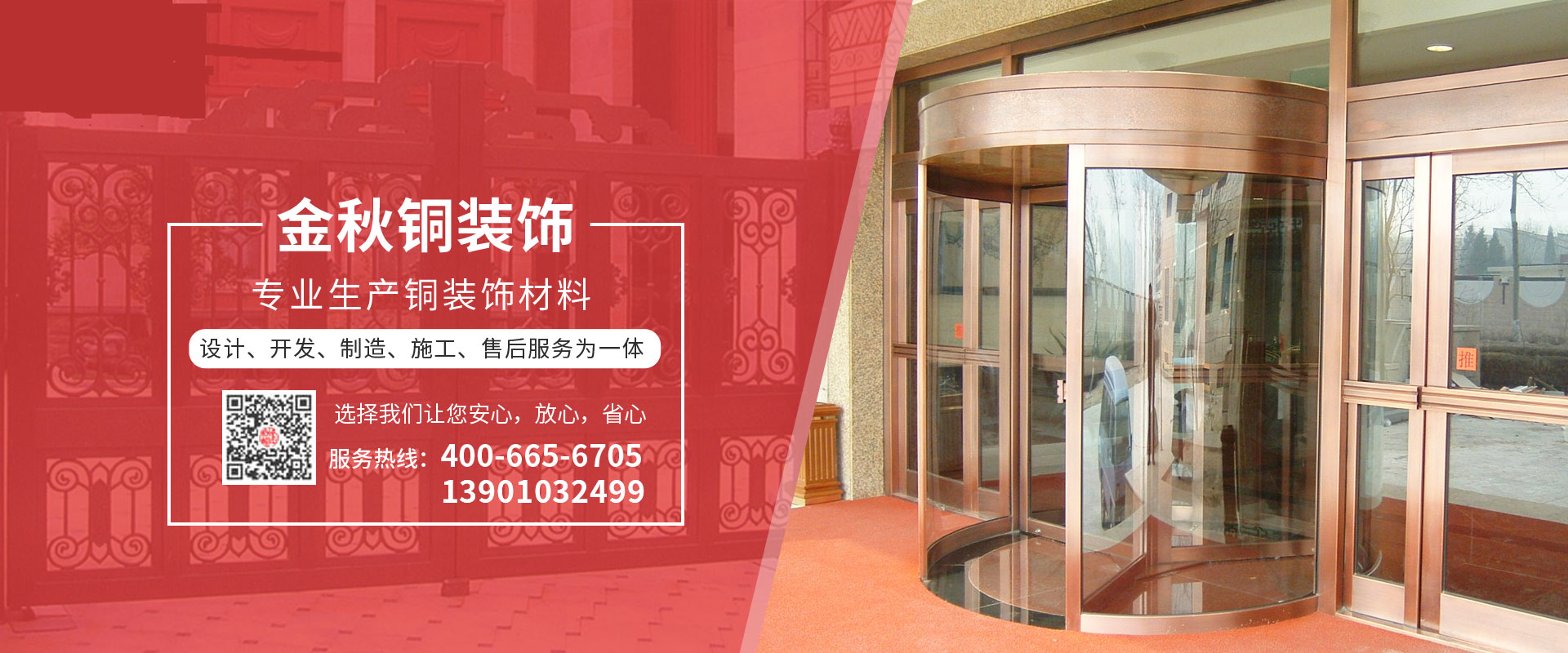 北京金秋銅裝飾材料有限公司是專業(yè)生產(chǎn)銅裝飾材料及設(shè)計(jì)、開發(fā)、制造、施工、售后服務(wù)為一體的大型綜合企業(yè)??沙薪咏ㄖ~裝飾工程及五星級(jí)酒店、別墅、博物館、樓樘管所等高檔銅裝飾項(xiàng)目;生產(chǎn)各種規(guī)格的旋轉(zhuǎn)門、平滑門、別墅門、電控門、工藝門、旋轉(zhuǎn)護(hù)欄、屋頂銅飾防水瓦、浮雕壁畫......